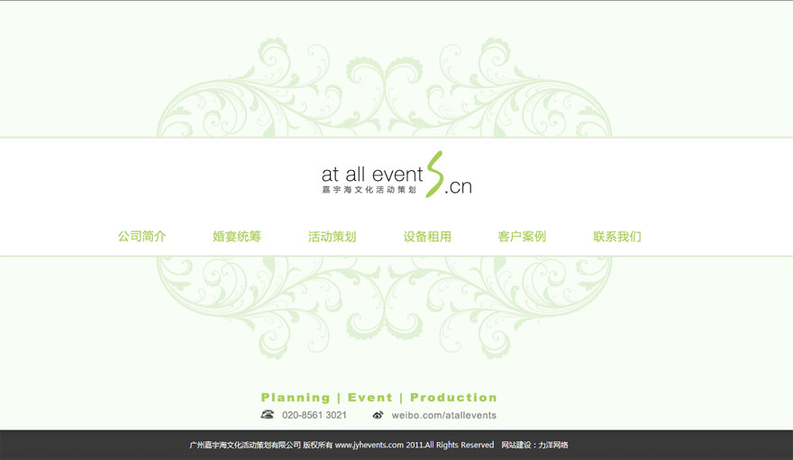 項(xiàng)目名稱(chēng):?廣州嘉宇海文化活動(dòng)策劃有限公司網(wǎng)站建設(shè)簽定日期:2011年11月3日注冊(cè)網(wǎng)址:www.atallevents.cn公司簡(jiǎn)介:?????廣州嘉宇海文化活動(dòng)策劃有限公司(at?all?events)是一家致力于活動(dòng)策劃、公關(guān)策劃、文化創(chuàng)意、品牌推廣、婚...