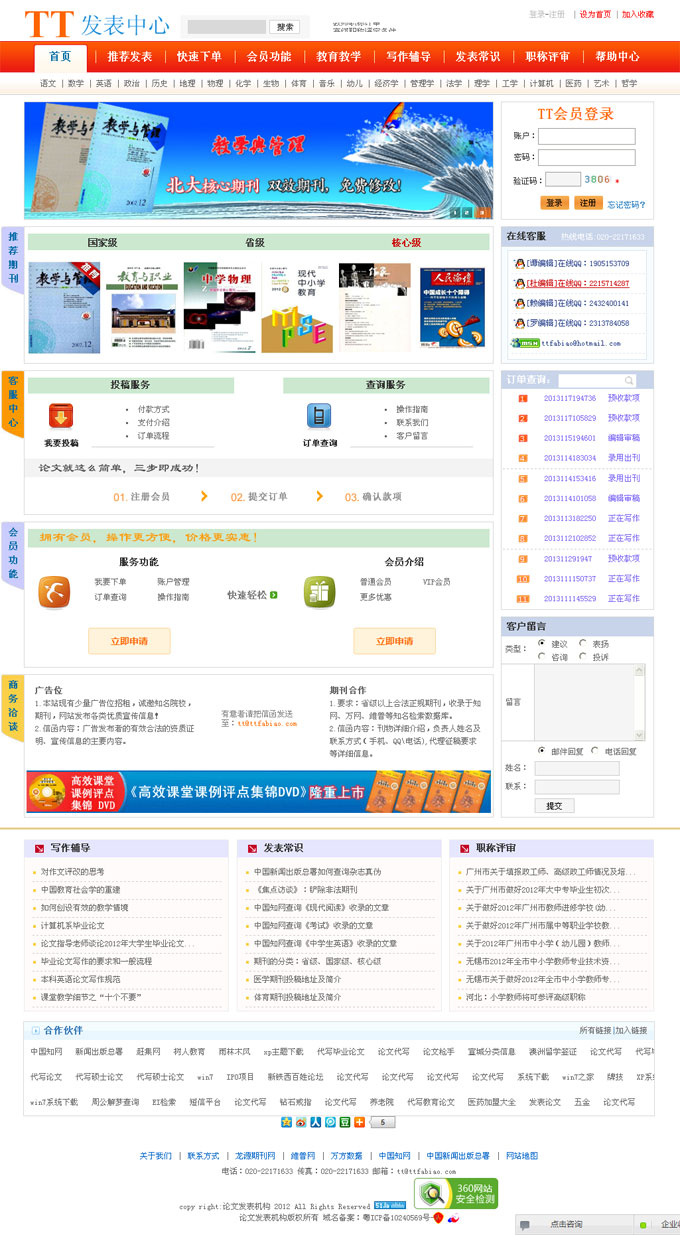 TT發(fā)表中心擁有8年專業(yè)為各類院校從事代理教育論文發(fā)表、教學論文發(fā)表的論文發(fā)表機構,以及提供相關專業(yè)咨詢服務。目前我們中心升級的TT發(fā)表中心是國內(nèi)唯一實現(xiàn)訂單管理系統(tǒng)的代理發(fā)表類網(wǎng)站。該系統(tǒng)操作簡單、方便、快捷,用戶可以在幾分鐘內(nèi)完成服務訂單所有操作,并可以在網(wǎng)上查詢服務訂單的進度。