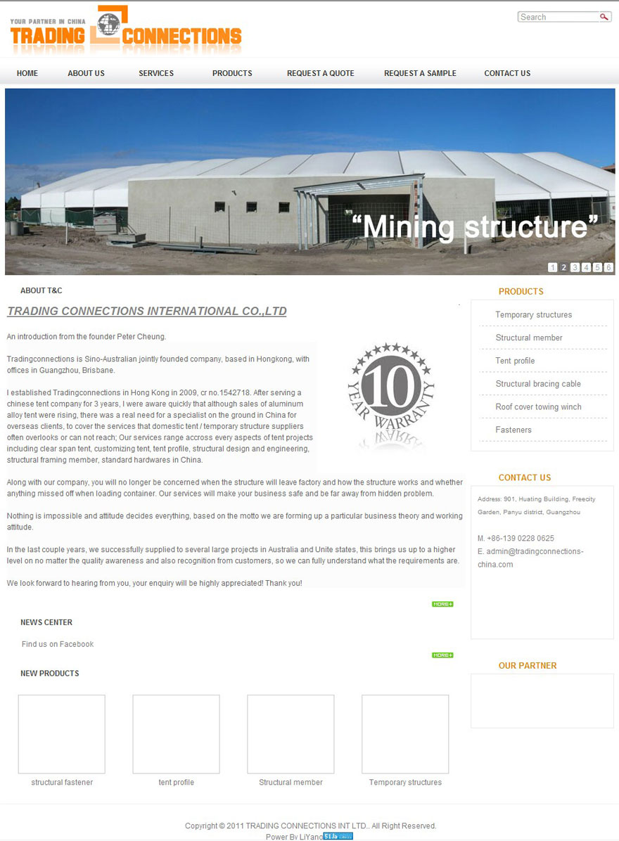 I established Tradingconnections in Hong Kong in 2009, cr no.1542718. After working in a chinese tent company for 3 years, I were aware quickly that although sales of aluminum alloy tent were rising, there was a real need for a specialist on the ground in China for overseas clients, to cover the services that domestic tent / temporary structure suppliers often overlooks or can not reach; Our services range accross every aspects of tent projects including clear span tent, customizing tent, tent profile, structural design and engineering, structural framing member, standard hardwares in China.