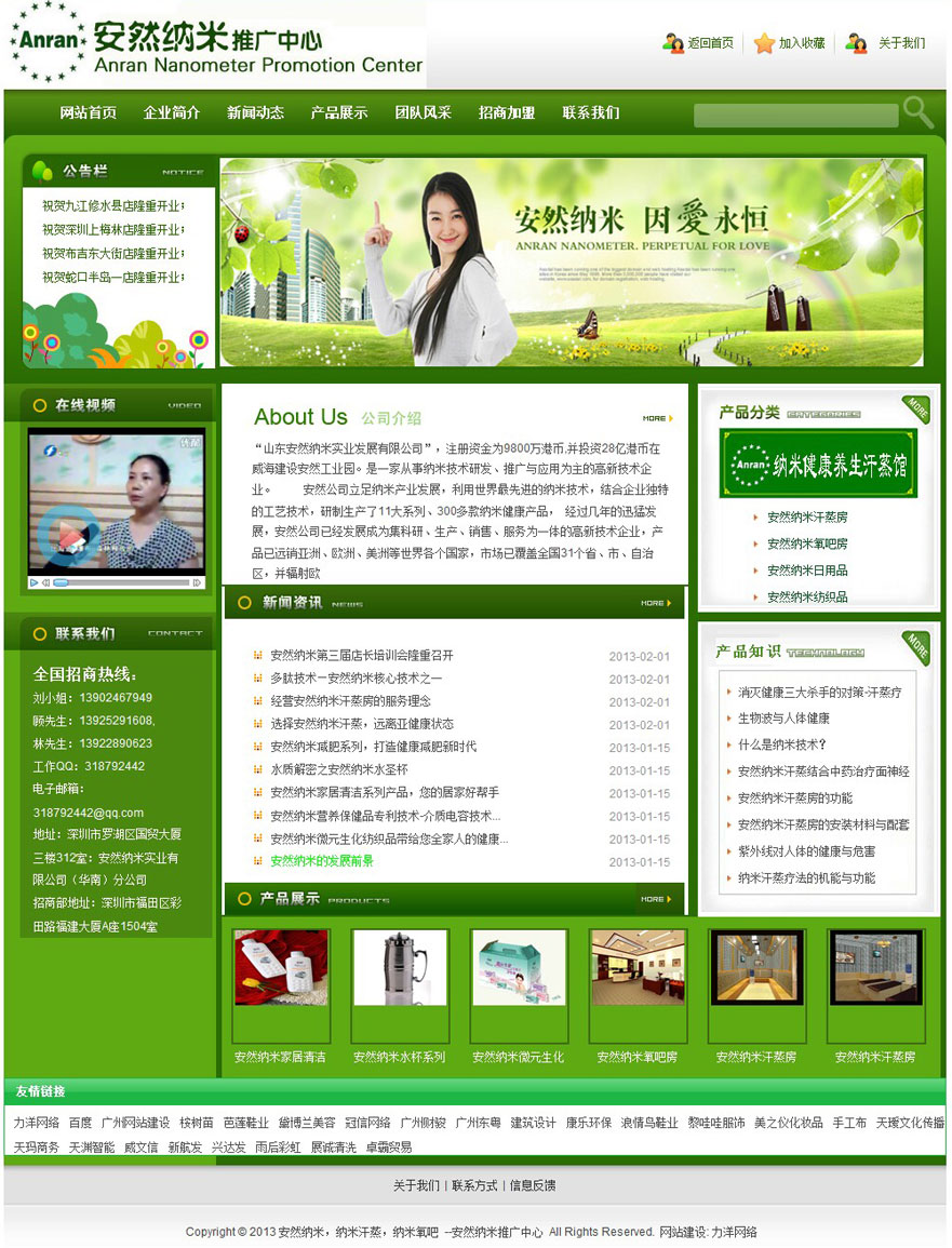 ? ? 公司立足納米產(chǎn)業(yè)發(fā)展,利用世界最先進的納米技術,結合企業(yè)獨特的工藝技術,研制生產(chǎn)了11大系列、300多款納米健康產(chǎn)品, 經(jīng)過幾年的迅猛發(fā)展,安然公司已經(jīng)發(fā)展成為集科研、生產(chǎn)、銷售、服務為一體的高新技術企業(yè),產(chǎn)品已遠銷亞洲、歐洲、美洲等世界各個國家,市場已覆蓋全國31個省、市、自治區(qū),并輻射歐洲市場,目前,已在國內建立了六個分公司,并在國際上建立了多家分公司。
