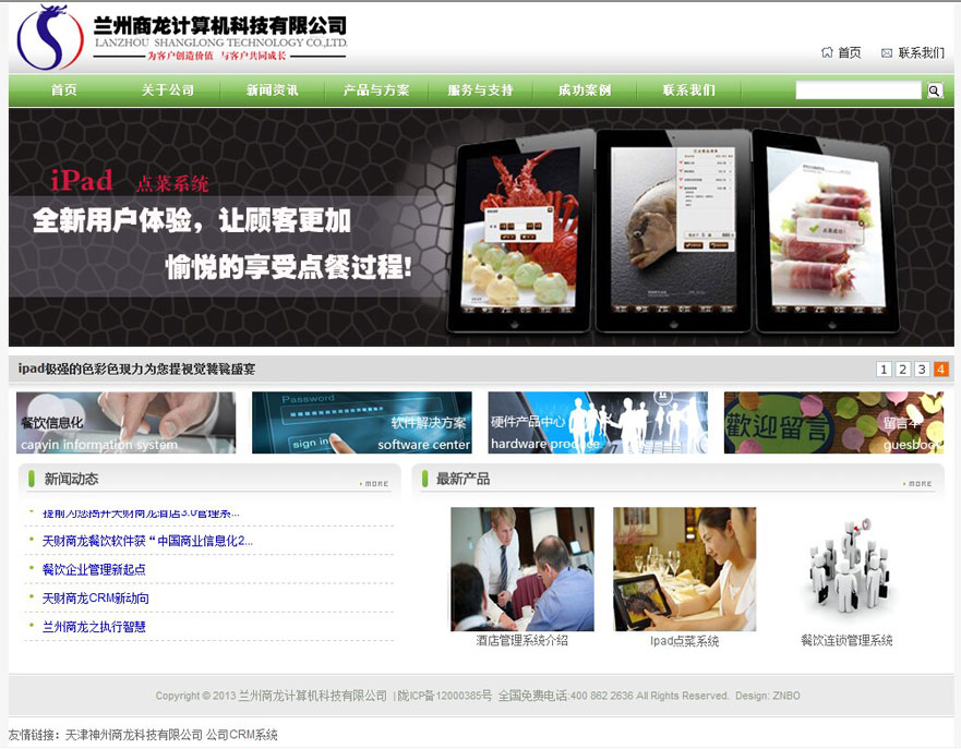 ? ? 蘭州商龍計(jì)算機(jī)科技有限那公司成立于2006年5月,公司主要涉及酒店餐飲娛樂及醫(yī)藥行業(yè)的管理軟件、監(jiān)控系統(tǒng)及弱電綜合布線工程。經(jīng)過六年多的發(fā)展,蘭州商龍成為甘肅地區(qū)最專業(yè)餐飲娛樂行業(yè)信息化整體解決方案供應(yīng)商,已為200家以上餐飲酒店企業(yè)提供了專業(yè)的信息化服務(wù)(管理軟件,點(diǎn)菜設(shè)備,遠(yuǎn)程監(jiān)控,連鎖管理平臺,會員CRM管理系統(tǒng)),產(chǎn)品在蘭州地區(qū)的中高端酒店餐飲市場占有率達(dá)70%以上,目前公司成為國內(nèi)最專業(yè)的酒店餐飲信息化供應(yīng)商天津神州商龍計(jì)算機(jī)科技有限公司甘肅地區(qū)的AAAA級合作伙伴,成為廣州金博軟件信息有限公司在蘭州地區(qū)的核心代理商,先后為鑫海大酒店,開盛海港集團(tuán)、皇家國宴、狗不理、銀峰、金泰餐飲、火吧餐飲、臨夏濟(jì)民藥業(yè)集團(tuán)等知名企業(yè)提供信息化產(chǎn)品及服務(wù),得到客戶廣泛認(rèn)可,我們致力于通過我們優(yōu)秀的產(chǎn)品,專業(yè)的實(shí)施隊(duì)伍,穩(wěn)定的售后服務(wù)為甘肅地區(qū)民營企業(yè)的飛速發(fā)展保駕護(hù)航!