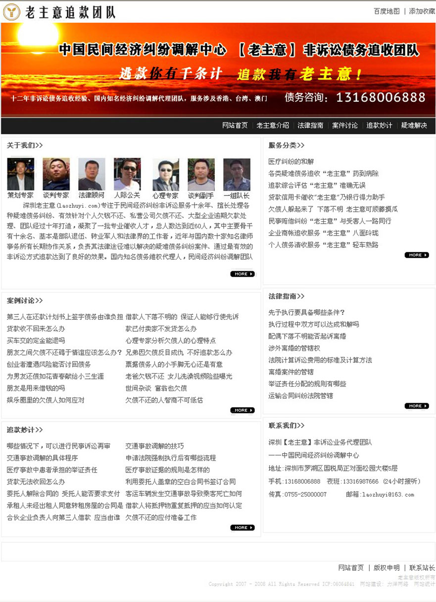 深圳老主意專注于民間經(jīng)濟糾紛非訴訟服務(wù)十余年、擅長處理各種疑難債務(wù)糾紛、有效針對個人、私營公司、大型企業(yè)債權(quán)債務(wù)處理、團隊經(jīng)過十年打造,凝聚了一批專業(yè)催收人才,總?cè)藬?shù)達(dá)到近60人,其中主要骨干有十余名、基本是部隊退伍、轉(zhuǎn)業(yè)軍人和法律界的工作者,近年與國內(nèi)數(shù)十家知名律師事務(wù)所有長期協(xié)作關(guān)系,負(fù)責(zé)其法律途徑難以解決的疑難債務(wù)糾紛案件、通過最有效的非訴訟方式追款達(dá)到了良好的效u。