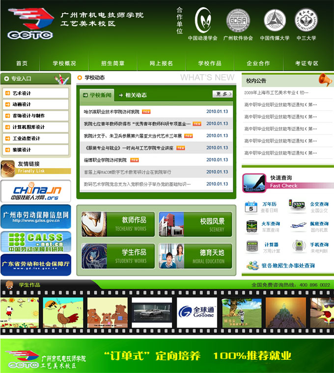 項(xiàng)目名稱:廣州機(jī)電技師學(xué)院工藝美術(shù)校區(qū)網(wǎng)站建設(shè)簽定日期:2010年3月9日網(wǎng)站首頁(yè)效果:...