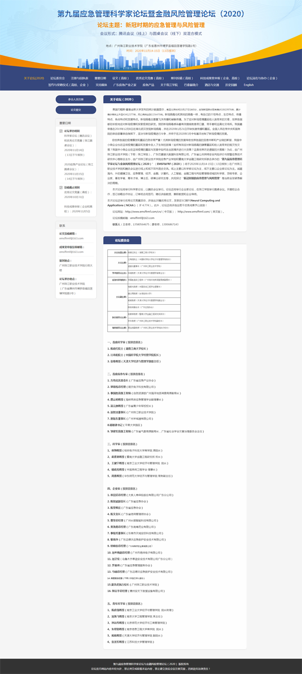 但世界各國的疫情爆發(fā)和蔓延仍然非常嚴(yán)重!尤其新冠疫情的發(fā)展導(dǎo)致世界各國的貿(mào)易中斷和產(chǎn)業(yè)鏈的斷裂,我國中小微企業(yè)也在這場疫情的蔓延和發(fā)展中走入了生存的困境!如何有效應(yīng)對新冠病毒的肆意蔓延和給人類帶來的毀滅性災(zāi)難?我國中小微企業(yè)在這場疫情的蔓延與發(fā)展中如何走出困境并進(jìn)行大突圍?這是世界歷史遺留的大難題!為此,由廣州珠江職業(yè)技術(shù)學(xué)院(下稱:珠江學(xué)院)、廣東巴拿赫大數(shù)據(jù)科技有限公司、廣東省公共網(wǎng)絡(luò)安全風(fēng)險評價與預(yù)警應(yīng)急技術(shù)研究中心等聯(lián)合主辦,由廣州珠江職業(yè)技術(shù)學(xué)院應(yīng)急產(chǎn)業(yè)學(xué)院和暨南大學(xué)金融工程研究所聯(lián)合承辦的“第九屆應(yīng)急管理科學(xué)家論壇與金融風(fēng)險管理論壇(2020)”(EMSF&FRF(2020))將于2020年11月14-15日(13日報到)在廣州珠江職業(yè)技術(shù)學(xué)院和騰訊會議進(jìn)行線上和線下雙向混合交流。線上主要以科學(xué)家論壇為主,線下主要以企業(yè)家論壇為主。誠邀海內(nèi)、外的健康衛(wèi)生、應(yīng)急管理、經(jīng)濟(jì)、金融、計算機(jī)、人工智能、金融工程與風(fēng)險管理等領(lǐng)域的科學(xué)家、頂級專家、企業(yè)家、著名學(xué)者、青年才俊、博士后、碩博士研究生等,共同探討“新冠時期的應(yīng)急管理與風(fēng)險管理”等當(dāng)前全球緊急解決的難題。